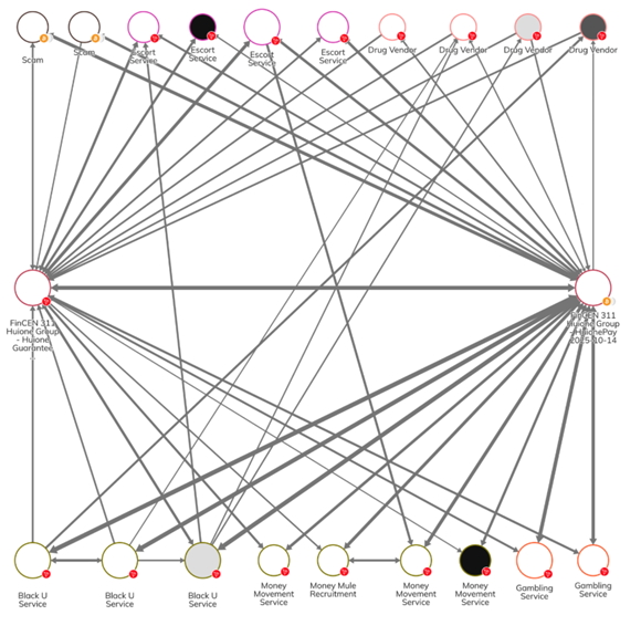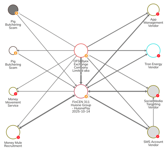 In addition, the UK’s Office of Financial Sanctions Implementation sanctioned Byex Exchange which has links to the Prince Group. The graph below shows the exchange’s interaction with the Huione Group and various scam technology vendors.
