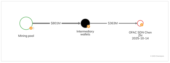 The Chainalysis Reactor graph below shows how Chen Zhi’s wallets received inflows indirectly from a mining pool.