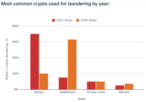 In terms of laundering, the use of stablecoins surged substantially between 2021 and 2024, while laundering using Bitcoin declined. The most common post-theft laundering patterns for Bitcoin are swapping to Monero via instant exchanges, accounting for 45% of stolen BTC. 70% of funds are directed through peel chains, and 30% are funneled through cross-chain bridges.
